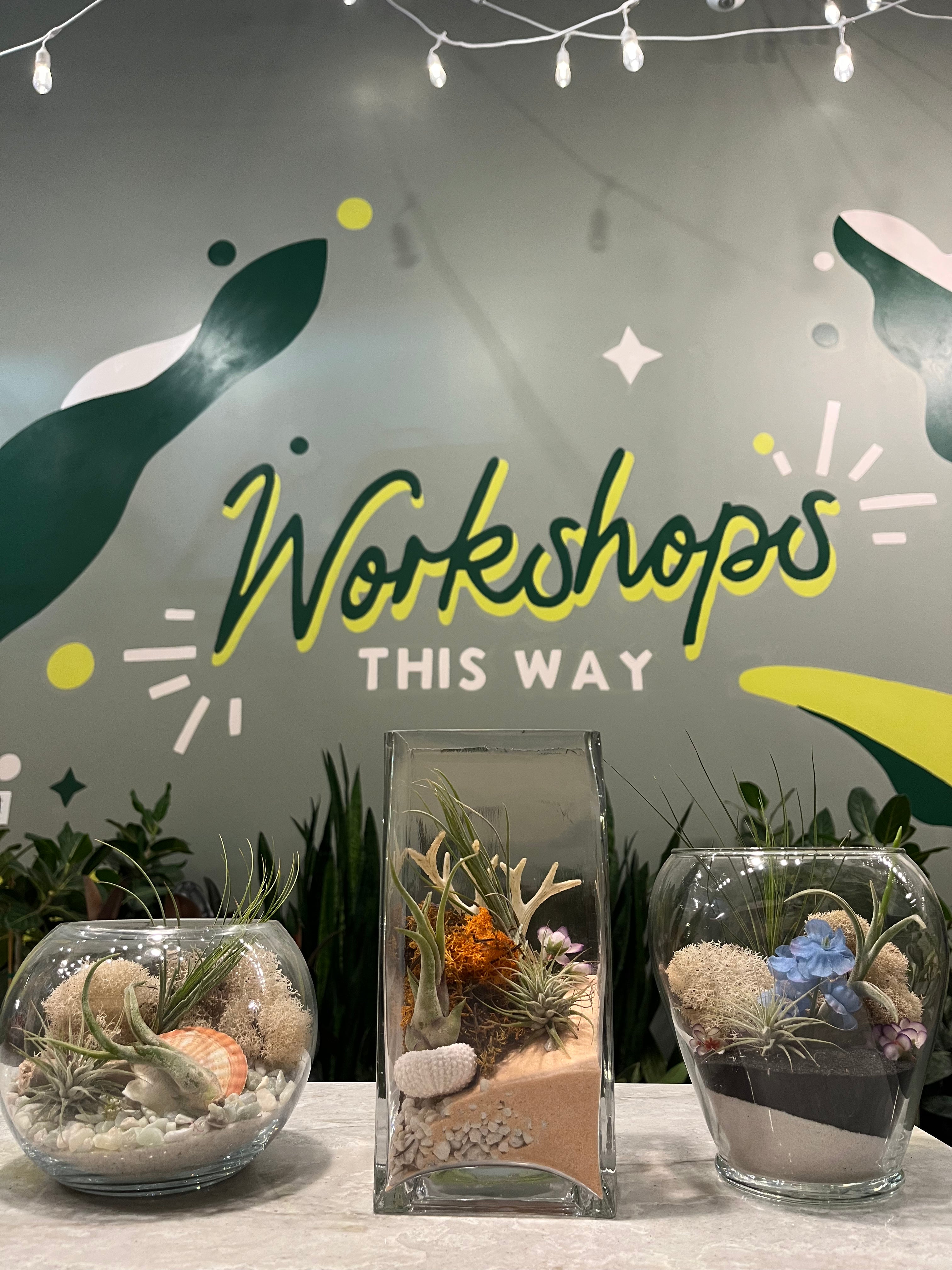 Explore our wide variety of specialty workshops such as Boozy Bonsai, Succulents and Sangria, Kokedama and more! Head to the workshop page to explore this months workshops.